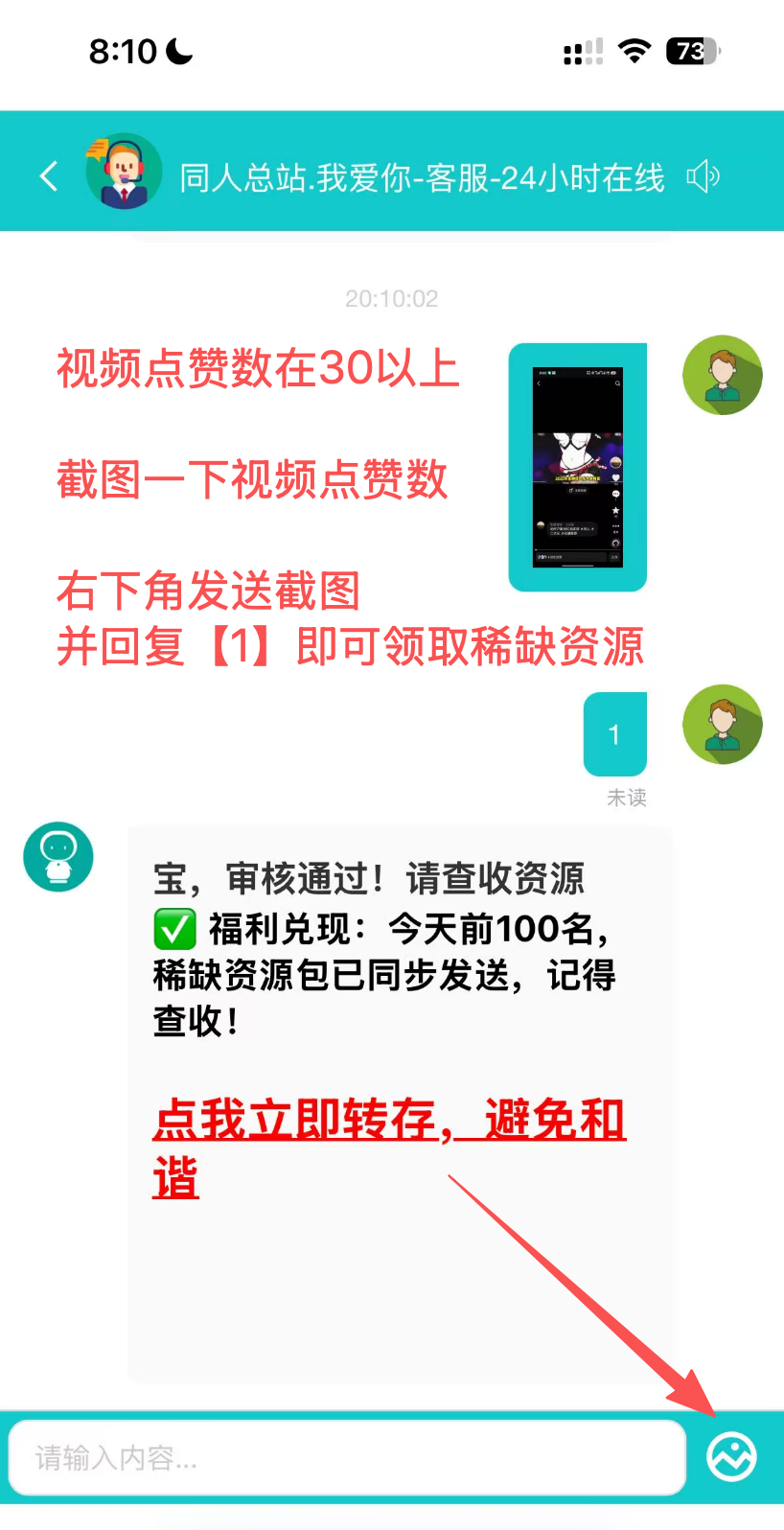 直接甩图领取即可! 想领取【精选资源】的,等待视频点赞量在30以上的,截图视频点赞数,给客服发送截图,并回复【1】即可领取!